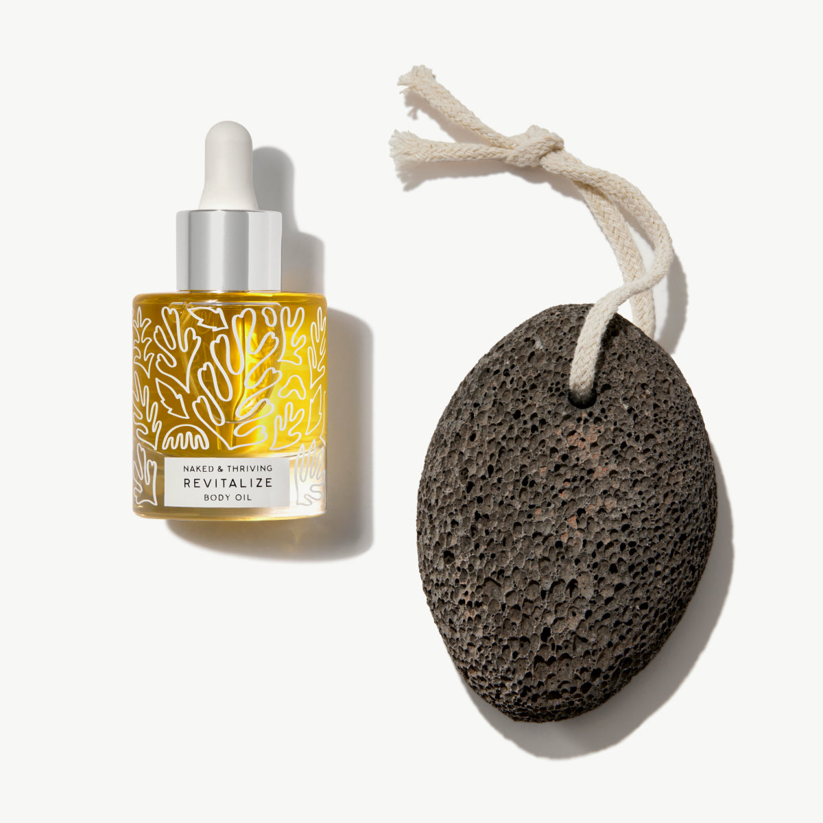 Gently exfoliate two ways to reveal skin that feels smooth and soft with our Revitalize Nourishing Body Oil and our sustainably-sourced Natural Pumice Stone.