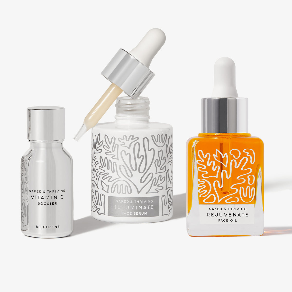 Illuminate BC+ Brightening Serum: Water, Aloe barbadensis (Aloe Vera) Leaf Juice*, Glycerin*, Glyceryl Oleate Citrate, Propanediol, Tetrahexyldecyl Ascorbate, Bakuchiol, Sodium Hyaluronate, Ferulic Acid, Adansonia digitata (Baobab) Seed Oil*, Glycyrrhiza glabra (Licorice) Root Extract, Morus nigra (Mulberry) Leaf Extract, Phyllanthus emblica (Gooseberry) Fruit Extract, Terminalia ferdinandiana (Kakadu Plum) Fruit Extract, Kanzou Furabonoido, Leuconostoc/Radish Root Ferment Filtrate, Sclerotium Gum, Acacia senegal (Acacia) Gum*, Caprylyl Glyceryl Ether, Caprylic/Capric Triglyceride, Phenethyl Alcohol, Mannitol, Ergothioneine, Sodium Hydroxide, Caprylhydroxamic Acid
