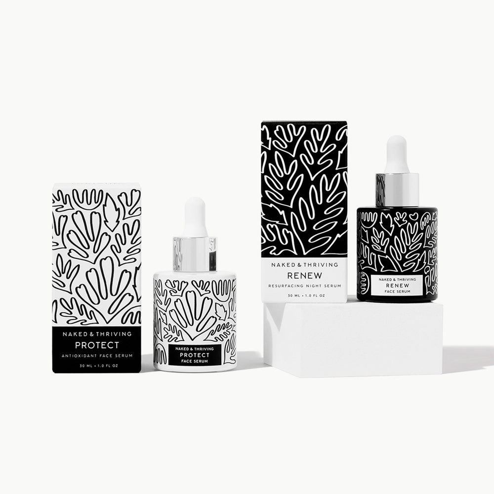 Cree una rutina nutritiva para la piel y obtenga los máximos beneficios botánicos con el suero de día Protect Antioxidant y el suero de noche Renew Resurfacing.